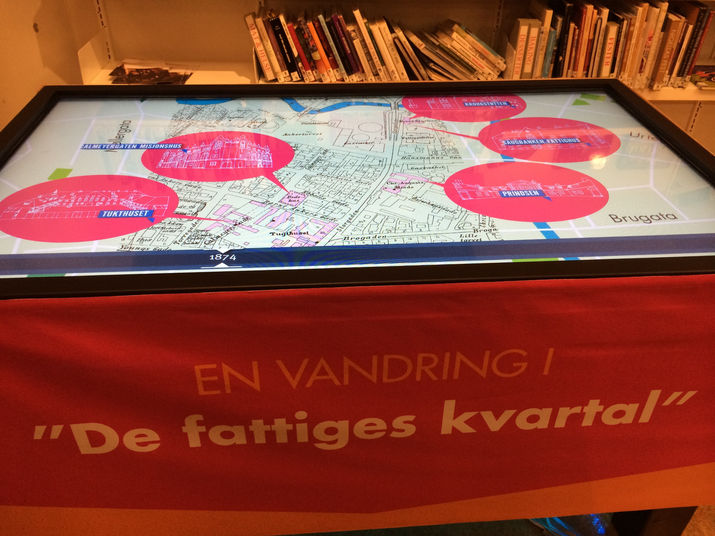 Combining an old map of "the poor quarter" with a contemporary map of Oslo. Illustrations of houses from the quarter, such as the Penitentiary, the poorhouse, and the hospital for the poor. The whole map with houses where shown on a touch screen, learning about the different houses by clicking on them and information text would show up.